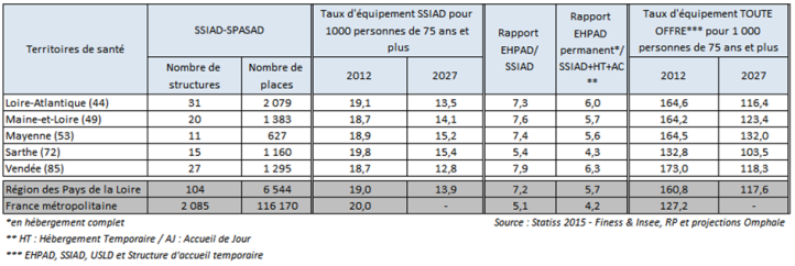 La région Pays de la Loire dispose de 106 SSIAD gérant 6617 places pour personnes âgées qui assurent, sur prescription médicale, des prestations en soins infirmier sous la forme de soins techniques et/ou de soins de base et relationnels, contribuant au maintien à domicile des personnes âgées. La région est par ailleurs dotée de 25 équipes spécialisées Alzheimer (ESA).