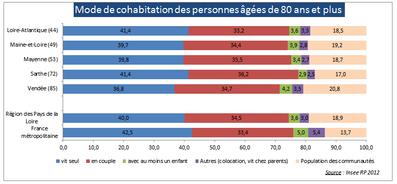 La majorité des personnes âgées vivent aujourd’hui à domicile. En effet, parmi les 213 000 personnes de 80 ans et plus domiciliées en région Pays de la Loire, 40 % vivent seules, 35 % sont en couple, 19 % vivent dans une communauté de type maison de retraite, 4 % vivent chez leur enfant et 3 % dans un autre mode (type colocation)3.