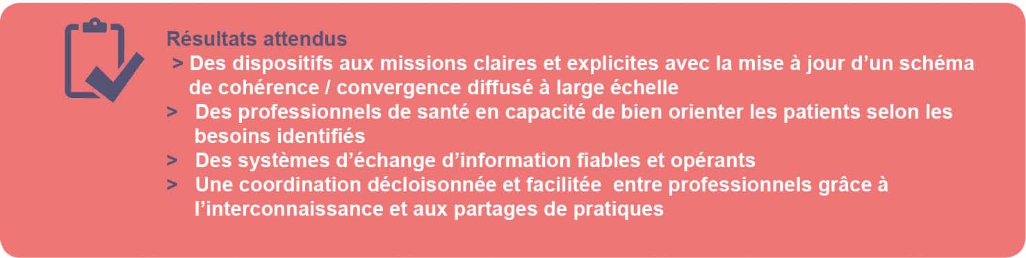 - Améliorer la connaissance des dispositifs ressources mobilisables par les professionnels de santé : MDA, CLIC pour les aînés…