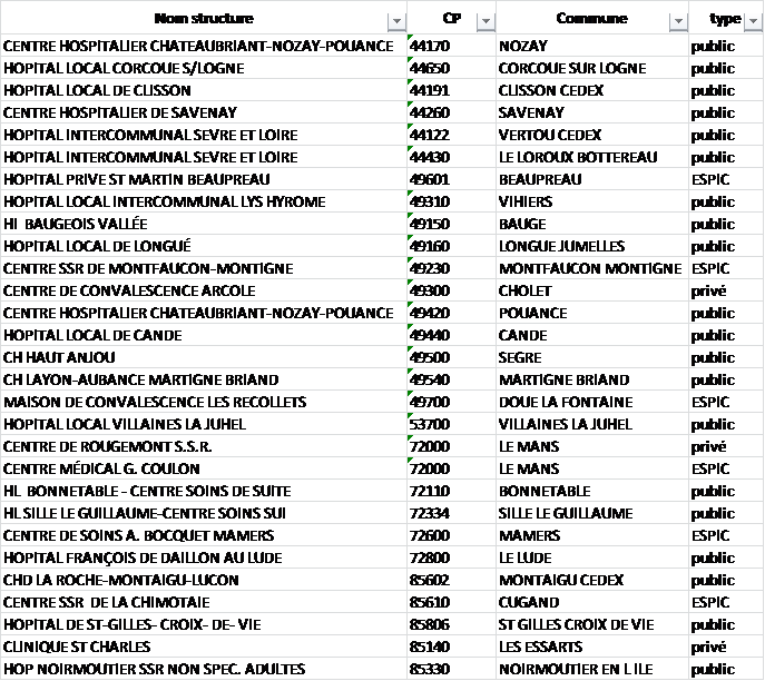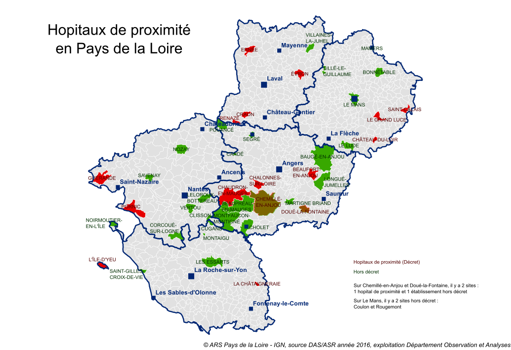 Sur les 30 ex-hôpitaux locaux en 2016, la région Pays de Loire compte 18 établissements qui répondent aux conditions d’éligibilité du décret du 20 mai 2016. Après proposition et concertation avec les directions des structures concernées, 16 établissements seront retenus sous le label « hôpitaux de proximité ». Un arrêté publié le 23 juin 2016 en précise la liste.