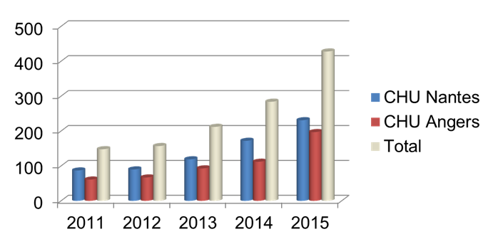 Parallèlement l’activité de pose de bioprothèses valvulaires aortiques par voie transcathéter (TAVI) s’est beaucoup développée avec 148 poses en 2011 et 428 poses en 2015, réparties sur 2 sites.