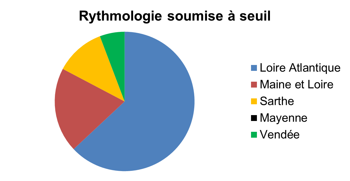 - 7 établissements autorisés pour les actes électro-physiologiques de rythmologie interventionnelle, de stimulation multisites et de défibrillation dont 1 établissement avec une activité limitée à l’interruption complète de circuit arythmogène au niveau de l’isthme cavotricuspidien avec courant de radiofréquence par voie veineuse transcutanée. Seuls, le département de la Mayenne et le territoire du Choletais, ne disposent pas d’offre de rythmologie soumise à seuil. L’activité régionale, soumise à seuil, a augmenté de plus de 50 % en 5 ans, passant de 1 650 actes à 2 607 actes.