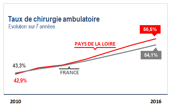 Au 31/12/2016, le taux de chirurgie ambulatoire régional s’élève à 56,5%, soit +2,4% au-dessus du taux France entière.