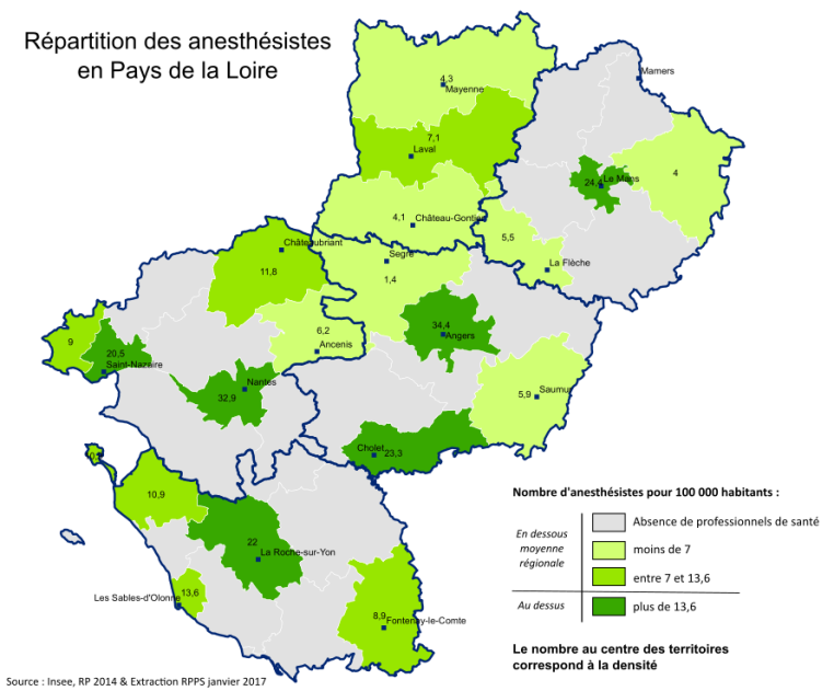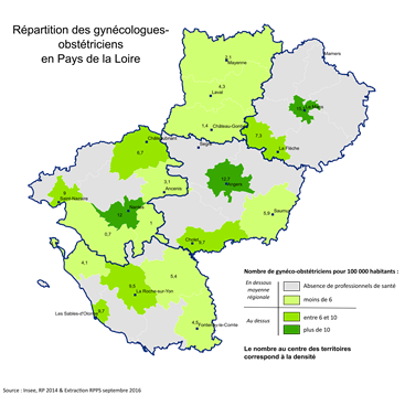 La région souffre globalement d’un manque très significatif de gynéco-obstétriciens. En 2015, le déficit est trois fois plus important dans la région par rapport à la France métropolitaine. Il est majeur pour 2 départements, la Mayenne puis la Vendée.