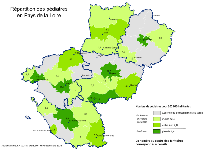 La densité de pédiatres de la région est inférieure à la densité de la France métropolitaine (37,1 versus 56,6 pédiatres pour 100 000 enfants de moins de 15 ans).Pour autant, la Mayenne et la Vendée ont une densité très inférieure par rapport à la région (13 pédiatres pour 100 000) et parmi les pédiatres vendéens 50 % ont plus de 55 ans (Sources : INSEE, RP 2014 et RPPS 2016 - DREES-RPPS 2016 et CNOM 2015).