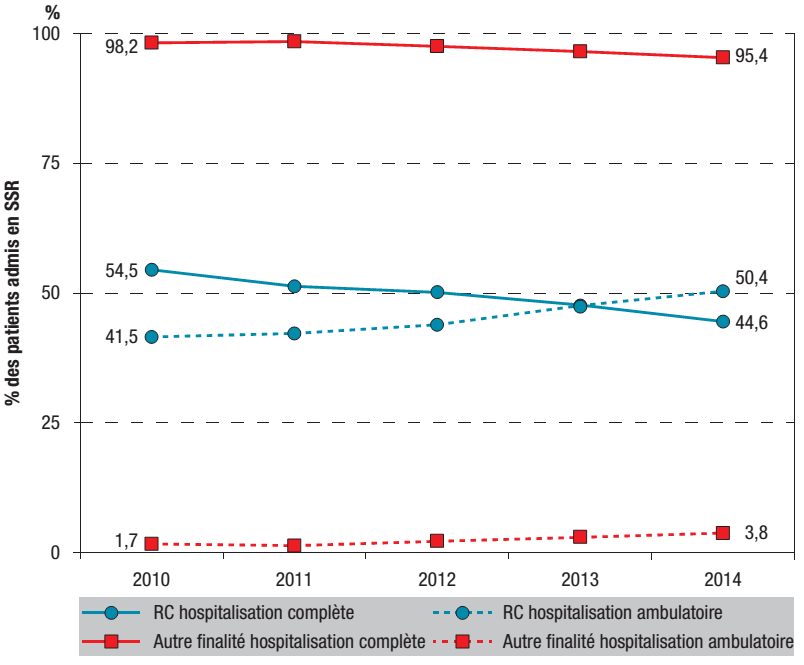 Figure 11 : Évolution de la proportion de patients en hospitalisation complète et en ambulatoire, entre 2010 et 2014, parmi les patients admis pour réadaptation cardiaque et parmi ceux admis pour « autre finalité »
