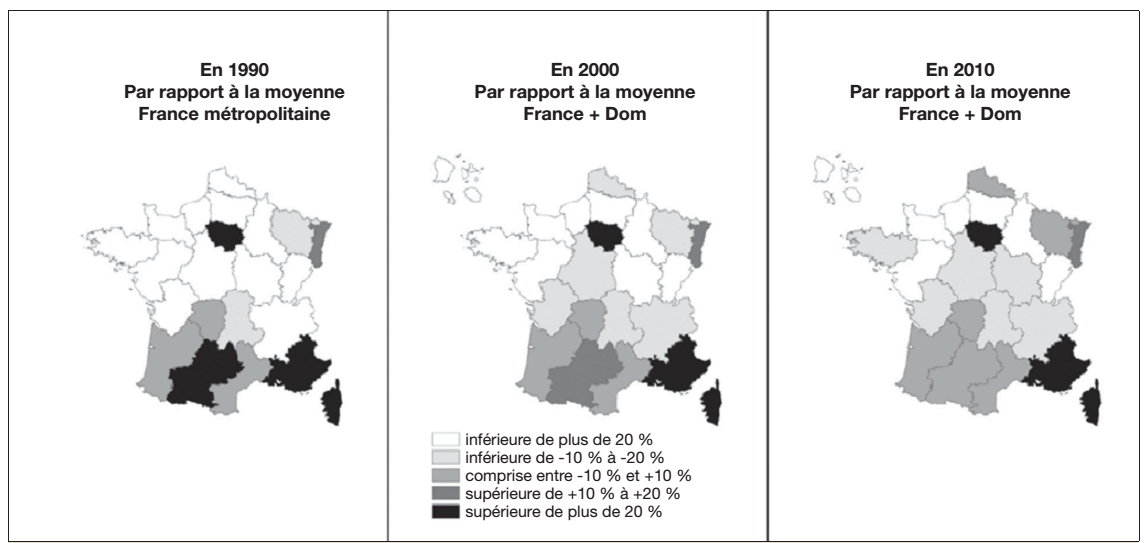 Figure 6 : Evolution de la densité des cardiologues sur le territoire Français sur 3 décennies de 1990 à 2010
