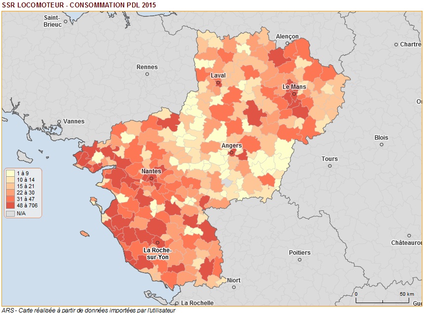 Ce champ de prise en charge connait une forte activité. En effet, les hospitalisations SSR des affections représentent le second recours soit 11 %. (Même volume que la neurologie) – Néanmoins la consommation (nombre de séjours par habitant) est variable selon les territoires (Cf.Carto).