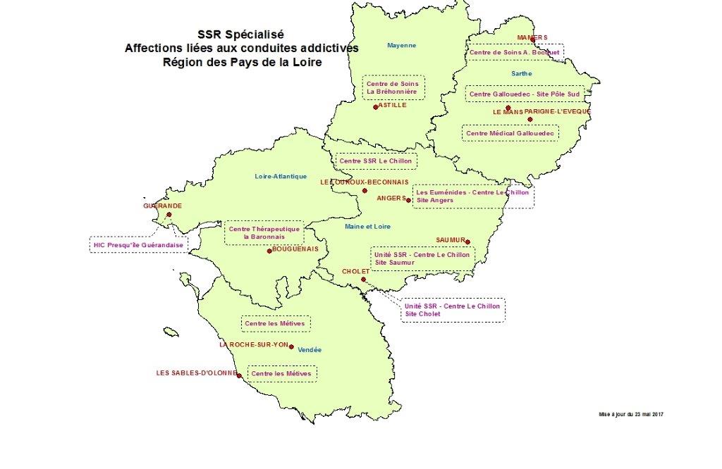 Au 15/01/2018, un total de 29 Consultations jeunes consommateurs (CJC) figurent dans l’annuaire des dispositifs spécialisés en addictologie sur le site de la SRAE addiction et sont réparties comme suit : 10 en Loire-Atlantique, 7 en Maine-et-Loire, 4 en Mayenne, 5 en Sarthe, 3 en Vendée