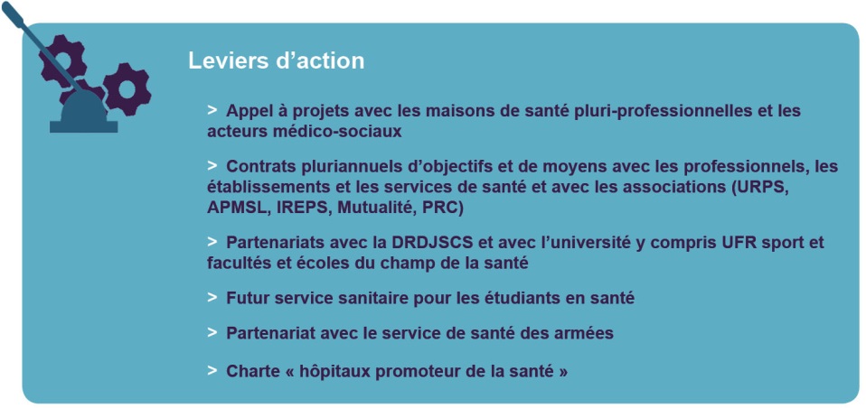 - En premier lieu, il s’agit de favoriser l’inscription de la promotion de la santé/prévention dans les projets des établissements et structures accueillant des usagers à travers les conventions qui les lient avec l’ARS, que ce soit avec les maisons de santé pluri-professionnelles, les établissements médico-sociaux et les établissements de santé.